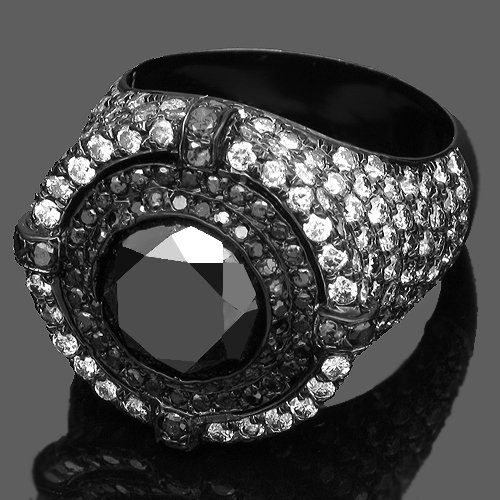 This glamorous mens diamond ring is handcrafted in 14K gold and plated with PVD. The ceterns set with one large round cut black diamond which is surrounded with additional smaller round cut channel set black diamonds. The outside frame is detailed with small round cut white diamonds. The band is also pave set with white round cut diamonds. The center measures to 3/4 inches in diameter and the frame weighs approximately 25.4 grams. The center stone totals to 4.75 carats and smaller round cut black diamonds total to additional 0.75 carats. The small white side stones total to 2.75 carats and are G in color and VS2 in clarity. Detailed to perfection, this uniquely designed mens diamond ring is an ideal accessory which guarantees any onlookers attention.