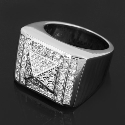 This masculine mens diamond pinky ring is crafted in highly polished 14K White Gold. The rectangle center piece displays a small pyramid which is pave set with brilliant small round cut diamonds. This pyramid is strategically placed in the center with invisibly set princess cut diamonds surrounding it. Very stylish and beautiful in appearance, this mens diamond ring is an ideal addition to your diamond collection.