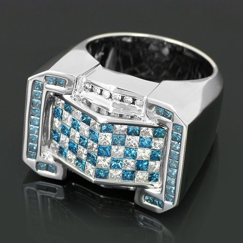 This large mens diamond ring is crafted in highly polished 14K white gold. The checker pattern design is displayed with a combination of blue and white princess cut diamonds which are placed on an invisible setting. The two opposite sides are channel set with blue diamonds and the upper and lower sections are channel set with round cut white diamonds. Weighing approximately 26.2 grams, the frame measures to 3/4 inches in width. This one of a kind mens diamond ring guarantees any onlookers attention.