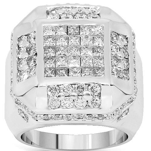 This large mens diamond pinky ring is crafted in highly polished 18K white gold. The center is invisibly set with small princess cut diamonds and surrounding with additional round cut diamonds. The frame measures to 19 mm in width and weighs 40.7 grams.